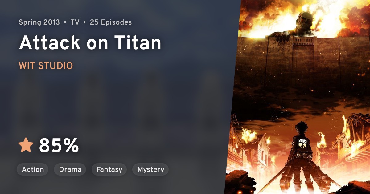 Type: TVEpisodes: 25Status: Finished AiringAired: Apr 7, 2013 to Sep 29, 2013Premiered: Spring 2013Broadcast: Sundays at 01:58 (JST)Producers: Production I.G, Dentsu, Mainichi Broadcasting System, Pony Canyon, Kodansha, Mad Box, Pony Canyon EnterpriseLicensors: FunimationStudios: Wit StudioSource: MangaGenres: Action, DramaThemes: Gore, Military, SurvivalDemographic: ShounenDuration: 24 min. per ep.Rating: R - 17+ (violence & profanity)